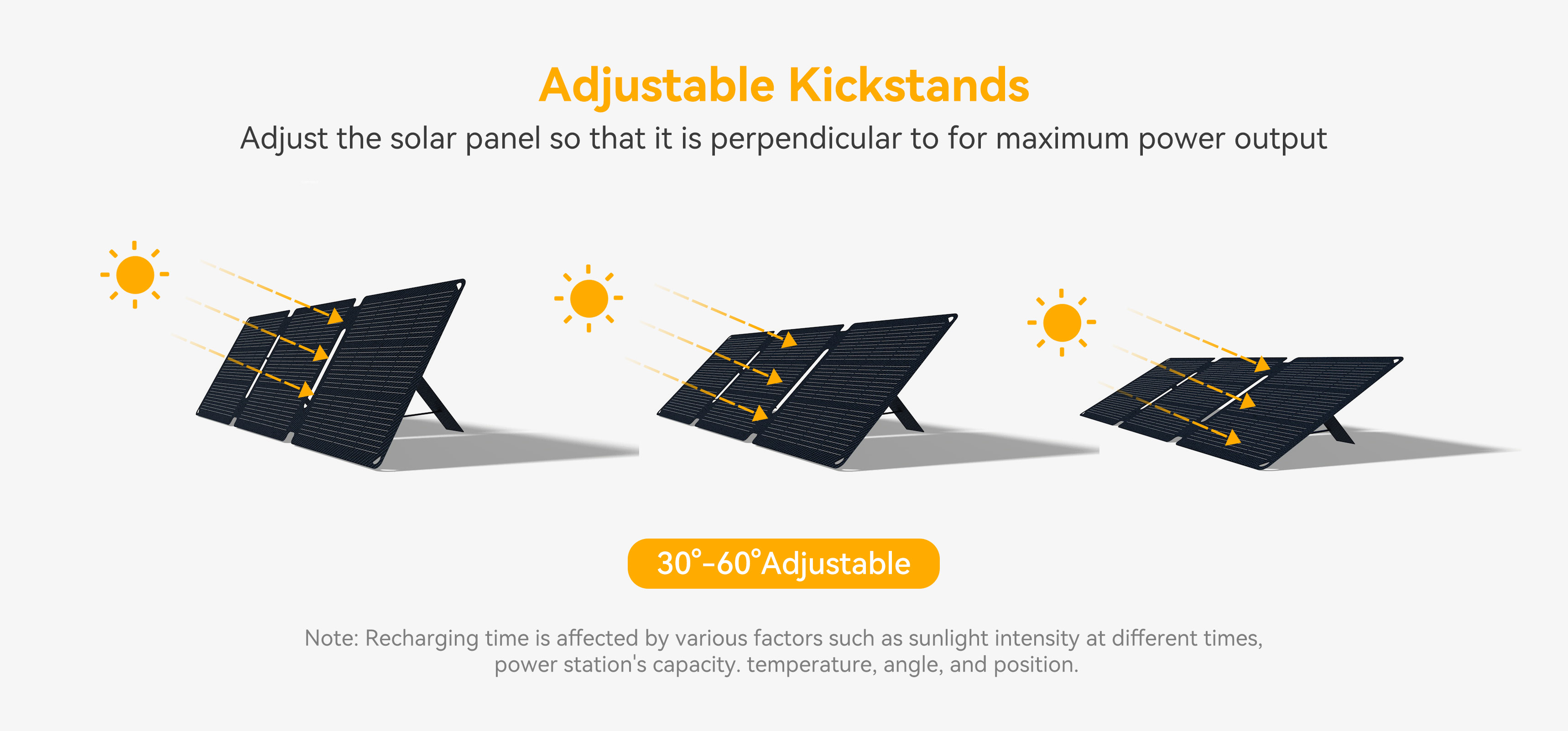 It features a magnetic handle for easy portability and storage, two adjustable kickstands for stable ground placement, and reinforced hanging holes for additional mounting options. It's perfectly suited for RV travel, camping, and emergency power needs.