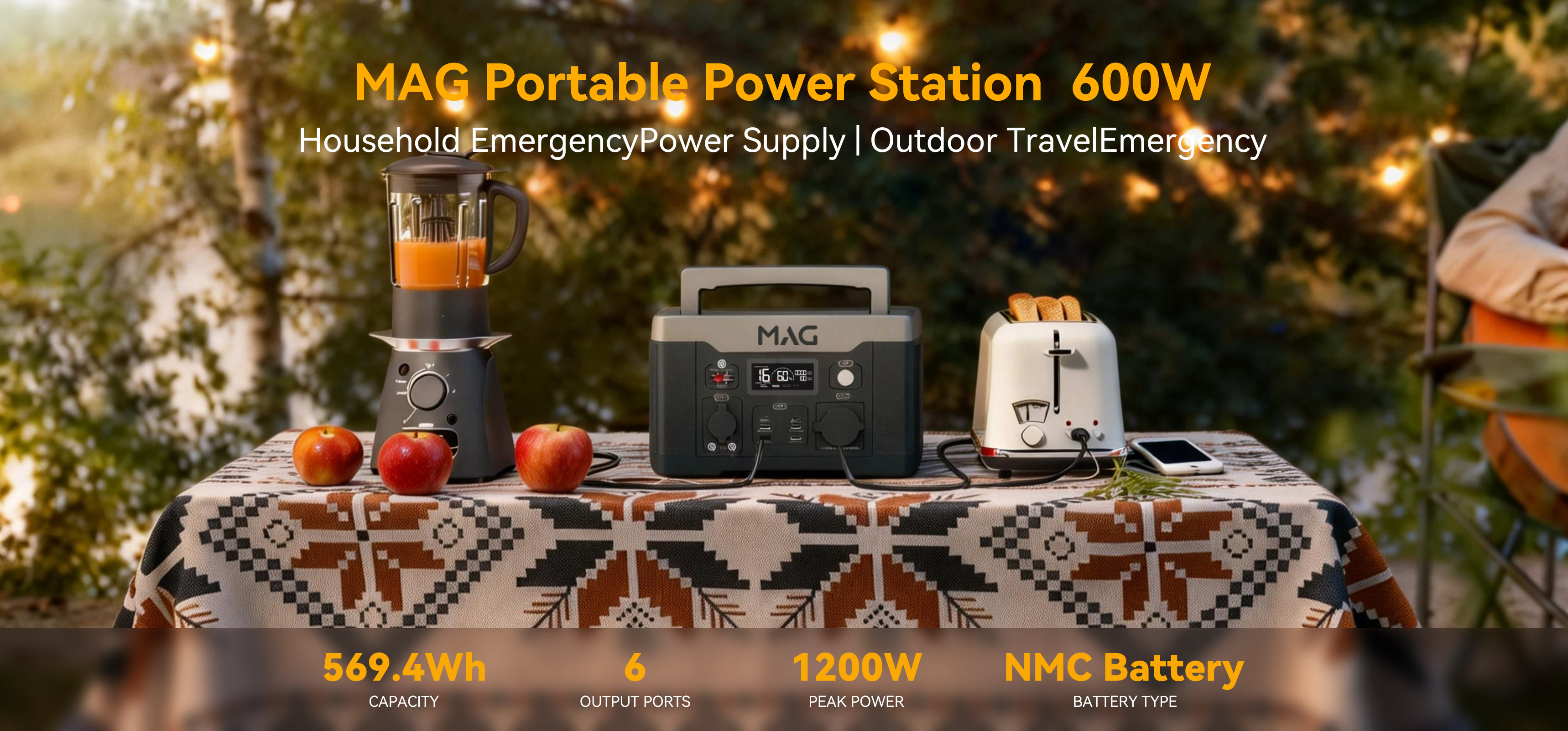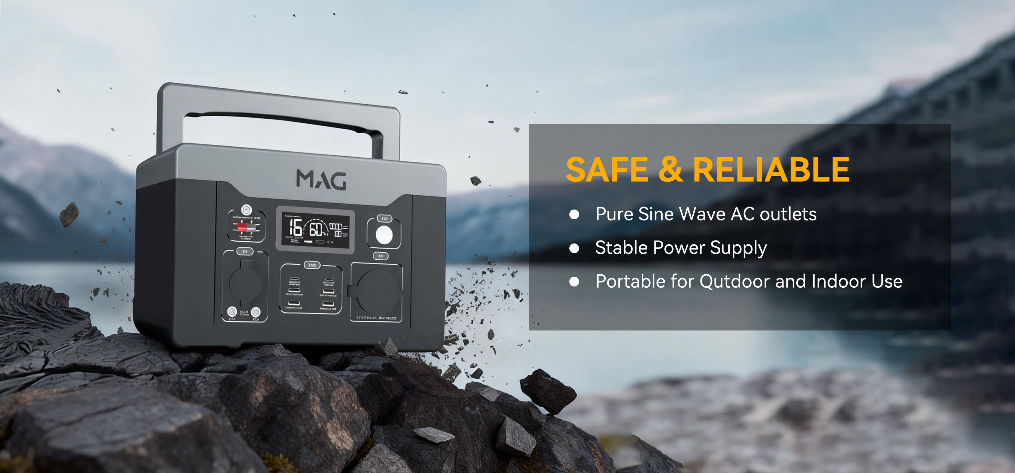 Armed with a 3072Wh LiFePO4 Battery 32140, the MAG-Y-3600A features 2 Pure Sine Wave AC outlets that deliver stable and safe 2400W power. The portable power station weighs only 31.2kg. You can simply rest assured in outdoor off-grid activities.