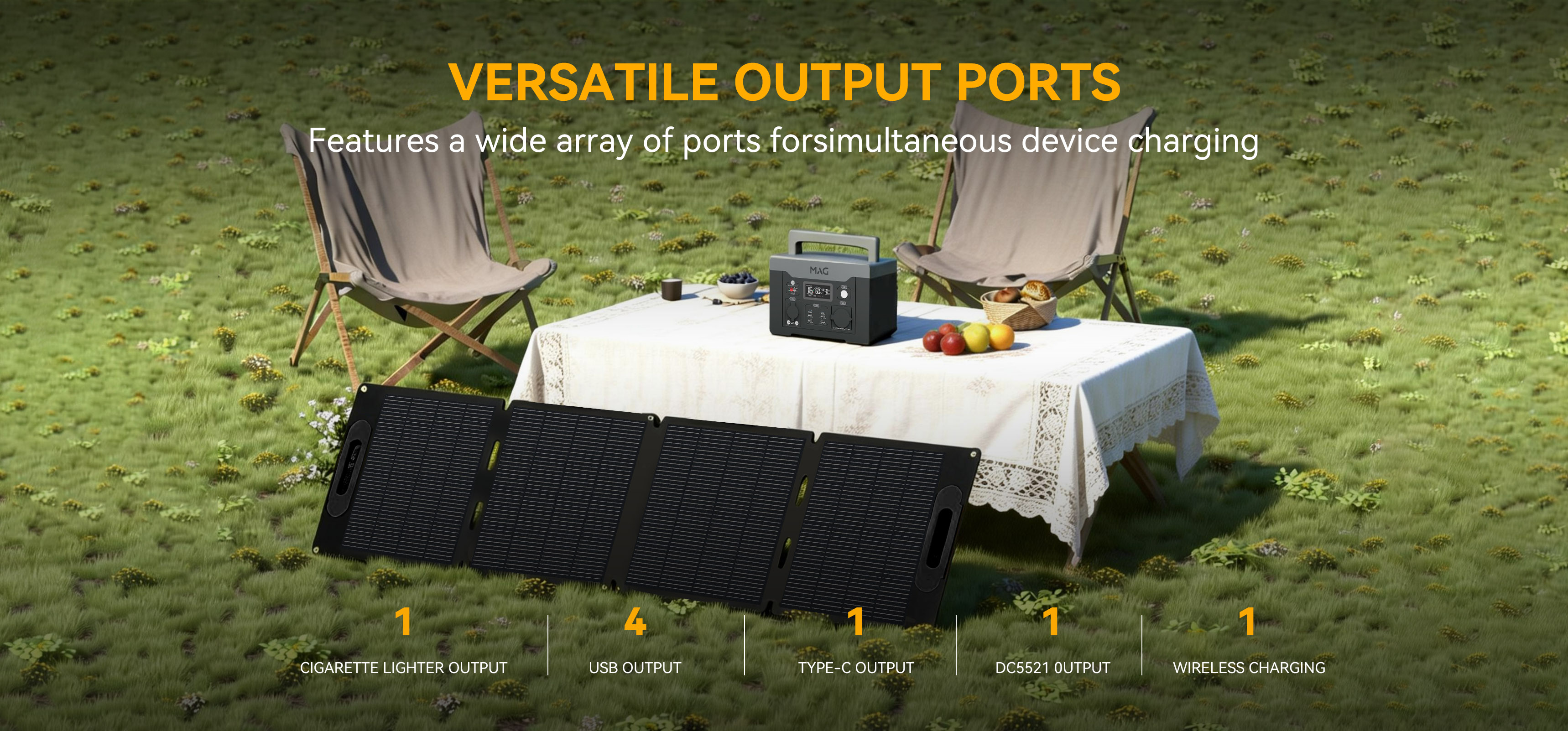Featuring 1* AC outlet AC230V+10V 50/60Hz Button Switch, 2* PD 100W/27W USB-C port , 1* Wireless Charging 15W port, 4*USB-A port and 1* Cigarette Lighter Output 12V Max.10A, the power station is camping essential that can recharge itself and charge (up to) 6 devices (e.g.Drones, Macbook, Cameras, etc.) at the same time to satisfy your outdoor needs.